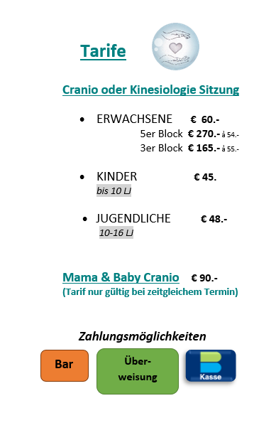 Datenschutzerklärung: Ihre Daten bzw. meine Sitzungsprotokolle dienen lediglich zu meiner Information um eine adäquate Sitzung durchführen zu können. Diese Informationen werden weder an Dritte weitergegeben noch elektronisch gespeichert. Mit ihrer Einverständniserklärung zur Durchführung einer Kinesiologie bzw. Craniositzung akzeptieren sie diese. Wenn sie damit nicht einverstanden sind, bitte ich sie mir dies mitzuteilen.